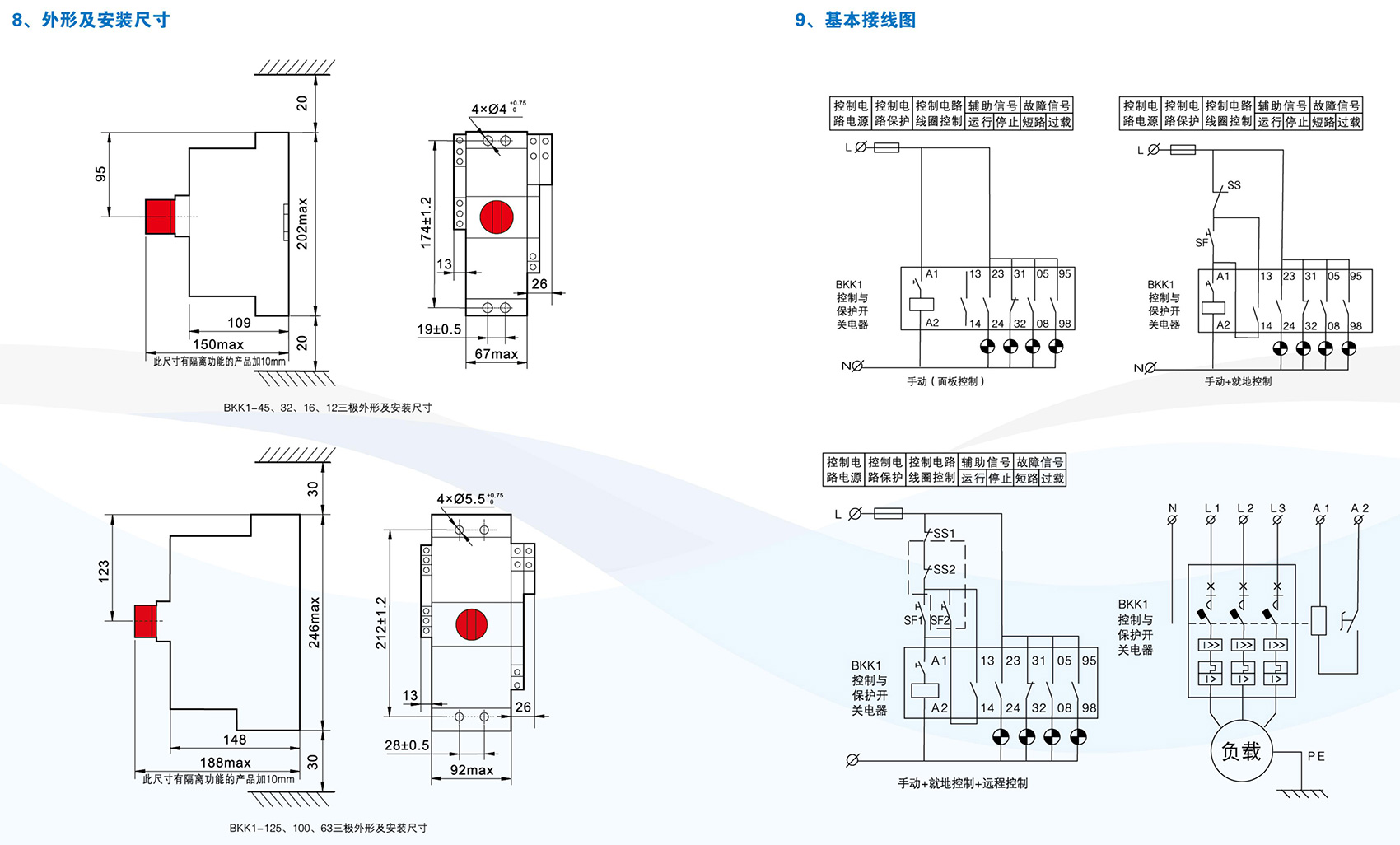 BKK1系列控制与保护开关电器主要用于交流50Hz(60Hz)、额定电压至690V、额定工作电流自0.4A至125A的电力系统中接通、承载和分断正常条件(包括规定的过载条件)下的电流,且能够接通、承载并分断规定的非正常条件(如短路)下的电流。BKK1系列采用模块化的单一产品结构形式,集成了传统的断路器(熔断器)、接触器、过载(或过流、断相)保护继电器、起动器、隔离器、电机综合保护器等多种传统的分离元器件。产品具有远距离自动控制与就地人力控制兼有的方式进行控制操作的功能,具有协调配合的时间-电流保护特性,具有控制与保护自配合、短路后连续运行,具有分断能力高,飞弧距离小、寿命长,具有保护整定电流均可调的特性,操作方便、配套模块多样齐全等优点,可以实现对电动机负载、配电负载的控制和保护。产品符合GB/T 14048.9《控制与保护开关电器》标准。